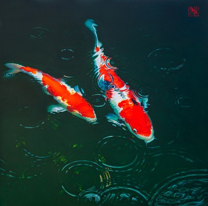 Verortet man den Koi in der asiatischen Welt, findet man die Kroete eher in den europaeischen Biotopen. Steht der Koi fuer Wohlstand, Luxus, Schoenheit, sogar Glueck, und dient er, voellig denaturiert, der Zierde (wird zu utopischen Preisen gehandelt), gehoert die Kroete eher in den Bereich des Naturbelassenen, aber auch des Haesslichen, wenn nicht Laestigen. Zwei Unvereinbare also: Koi und Kroete passen einfach nicht zusammen, moechte man sagen. Aber weit gefehlt: in dieser aus der Tradition der chinesischen Tuschzeichnung schoepfenden Animation macht sich eine Kroete an den groessten und schoensten Koi im Teich heran und setzt sich in inniger Umklammerung auf ihn. Fressen und Gefressenwerden sind hier nicht thematisch. Was also will sie von ihm? Ist sie in ihn vernarrt und auf Kopulation aus? Dafuer hat die Natur in diesem Fall kein Equipment vorgesehen. Erste Loesung, die von der Kuenstlerin angeboten wird: die Kroete laesst frustriert vom Objekt ihrer Begierde ab. Zweite Loesung: sie verharrt in der Umarmung, die eher Umklammerung ist, bis der Koi, von ihren Koerpergiften zugrunde gerichtet, verendet. Eine grosse Metapher des Andersseins, eine Allegorie auf Anziehung und Abstossung innerhalb kultureller Differenz. AEhnlichkeiten mit Menschenwesen nicht ausgeschlossen.
