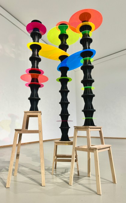 "Die Auswahl der Exponate zeigt zeitgenössische Kunstwerke, die Farbe als zentrales Element einsetzten: Malerei, Video-Malerei, Raumobjekte; Malmaschine.